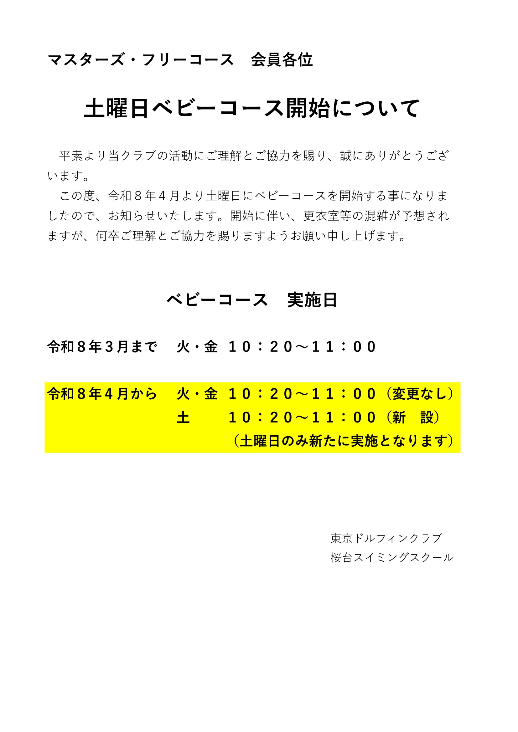 土曜日ベビーコース開始について